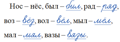 Нос – нёс, был – ____, рад – ___, воз – ____, вол – ____, мыл – _____, мал – ____, вазы – _____ .