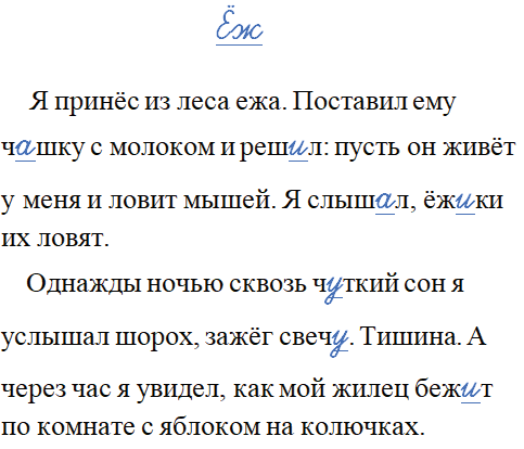 Вставим буквы в сочетания ЧА-ЩА, ЖИ-ШИ, ЧУ-ЩУ: чашку, решил, слышал, ёжики, чуткий, свечу, бежит.