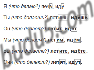Летишь, летим, летите, летят, идёт, идём, идёте, идут, летит, идёшь, лечу, иду.