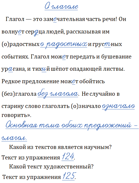 Глагол — это зам_чательная часть речи! Он волну_т сер_ца людей, рассказывая им (о)радостных __________ и грус_ных событи_х. Глагол мож_т передать и бушевание ур_гана, и тих_й шёпот опадающей листвы. Редк_е предложение мож_т обойтись (без)глагола __________. Не случайно в старину слово глаголать (о)значало __________ гов_рить».