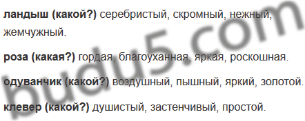 Слова-подсказки: гордый, воздушный, серебристый, пышный, душистый, застенчивый, скромный, благоуханный, нежный, яркий, золотой, роскошный, жемчужный, простой.