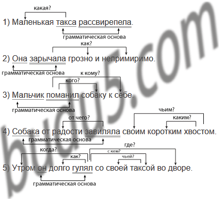 1) Маленькая такса рассвирепела. 2) Она зарычала грозно и непримиримо. 3) Мальчик поманил собаку к себе. 4) Собака от радости завиляла своим коротким хвостом. 5) Утром он долго гулял со своей таксой во дворе.
