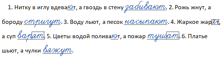 1. Нитку в иглу вдева_т, а гвоздь в стену ___. 2. Рожь жнут, а бороду ___. 3. Воду льют, а песок ___. 4. Жарко́е жар_т, а суп ___. 5. Цветы водой полива_т, а пожар ___. 6. Платье шьют, а чулки ___.