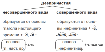 Деепричастия совершенного вида образуются от основы инфинитива совершенного вида при помощи суффиксов -в-,-ши-, -вши-: