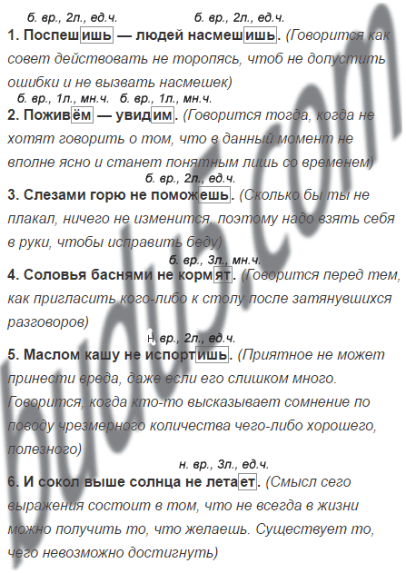 Определяем время, лицо и число глаголов: поспешишь (буд. вр., 2-е л., ед. ч.), насмешишь (буд. вр., 2-е л., ед. ч.), поживём (буд. вр., 1-е л., мн. ч.), увидим (буд. вр., 1-е л., мн. ч.), поможешь (буд. вр., 2-е л., ед. ч.), кормят (наст. вр., 3-е л., мн. ч.), испортишь(буд. вр., 2-е л., ед. ч.), летает (наст. вр., 3-е л., ед. ч.).
