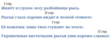 1. Живёт, глухом, разбойница-рысь, лесу, в. 2. В, хорошо, лесной, видеть, рысьи, темноте, глаза. 3. Тихо, по, её, лапы, ступать, земле, кошачьи. 4. Хорошо, украшенные, слышать, уши, рысьи, кисточками.