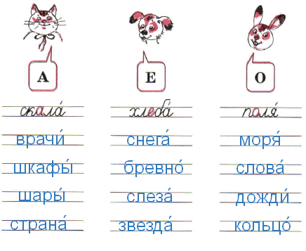 М_ря́, сл_ва́, сн_га́, бр_вно́, п_ля́, д_жди́, вр_чи́, сл_за́, шк_фы́, ш_ры́, зв_зда́, к_льцо́, стр_на́, хл_ба́.