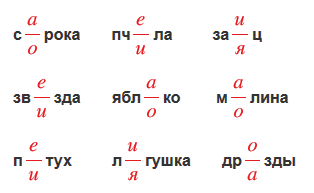 | т..традь б..рёза д..ревня вет..р | ябл..ко м..л..ко ..дежда п..суда | к..пуста р..бота к..р..ндаш сах..р | ..зык за..ц ..нварь л..гушка |